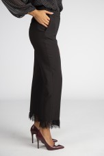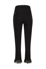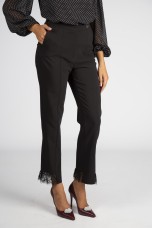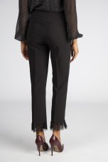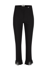 The I26CAL08RND10 straight-cut trousers reinterpret classic sophistication with a delicate, feminine touch. Made in Portugal from 87% recycled polyester and 13% spandex, they combine comfort and durability, ensuring a flawless fit that moves with you without losing its shape. The high waist elongates the silhouette and enhances posture, while the front zip and heart-shaped metal button on the waistband add a subtle and charming detail. The two side pockets add practicality, and the distinguishing detail is the lace detail at the ankle, which adds a romantic and elegant touch, transforming the piece into a versatile choice for day or night. Black is an indispensable ally in the wardrobe, adapting to multiple styles and occasions. It pairs impeccably with light-coloured shirts for a sophisticated contrast, with delicate blouses for a professional look, or with satin tops for a more refined look. Ideal for those looking for versatility and attention to detail, these trousers balance timeless elegance with a subtle charm that does not go unnoticed.What does the icon in the picture mean?